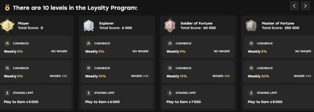 - Weekly Cashback: Hver spilari, óháð stigi, fær hlutdeild í vikulegu 5% cashbacki sem hefur enga veltukröfu. Þetta eru raunverulegir peningar sem leggjast inn á reikninginn þinn.
